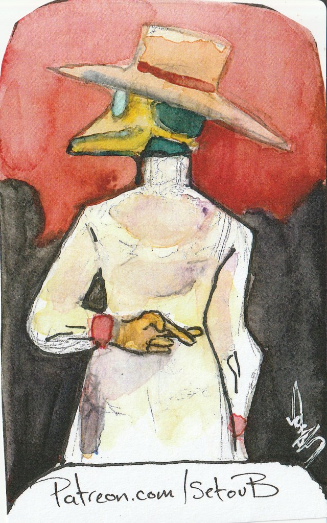 This is the picture and title I drew, at random, by Setou B and Jay, respectively, and what I came up with, in an effort to put them together. It wasn’t easy!