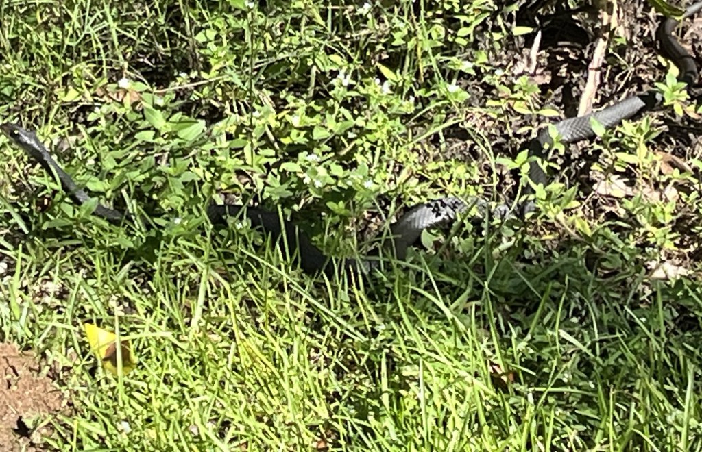 I call him “Longfellow”, for obvious reasons. I reckon he’s a good five feet in length. Isn’t he, as Steve Irwin might have said, “a beauty”? I’m told black racers will either skedaddle, full tilt, or lie stock still, hoping not to be spotted. Longfellow never moved a muscle. I believe he saw me, first.